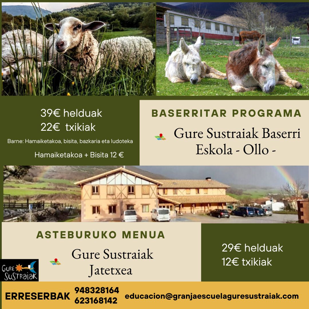 EGUN BATEKO BASERRITAR PROGRAMA Asteburu eta jaiegunetan 11.00etatik aurrera GEHIEN GUSTATZEN ZAIZUN AUKERA ERABAKI BISITA + HAMAIKETAKOA  Baserrira bisita gidatua eta hamaiketakoa (txistorra pintxoa edo croqueta eta edaria.) Prezioa 12€, helduek eta 2023an jaiotako adingabeak barne; 6€, 3 urtetik beherakoak (kontsumizioa egiten dutenak)    BISITA + HAMAIKETAKOA + BAZKARIA +